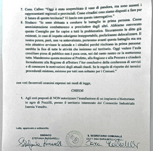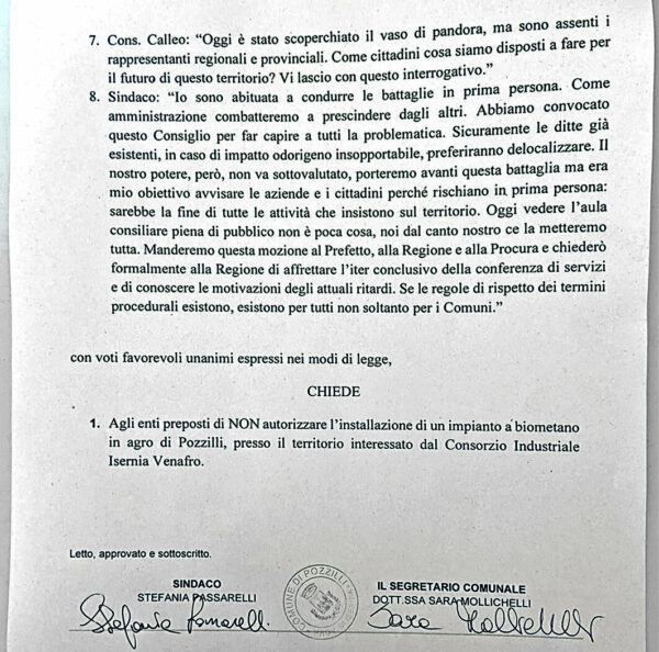 Senza troppi giri di parole e con un velo di ironia Passarelli rimarca «l’assenza dei politici regionali, sicuramente impegnati in qualche manifestazione meno compromettente e più… politica. L’amministrazione di Pozzilli – ancora la sindaca – difenderà il suo territorio con ogni forza e si batterà con tutte le armi a disposizione. Contestualmente all’inoltro della delibera alla Procura, a S.E. il Prefetto e alla Regione Molise – conclude la prima cittadina di Pozzilli – chiederò le motivazioni della lungaggine della convocazione decisoria della conferenza de servizi per deliberare definitivamente sull’argomento. È trascorso oltre un anno e vorremmo capire il perché di tutto questo tempo: coincidenza o strategia? Grazie a tutti».