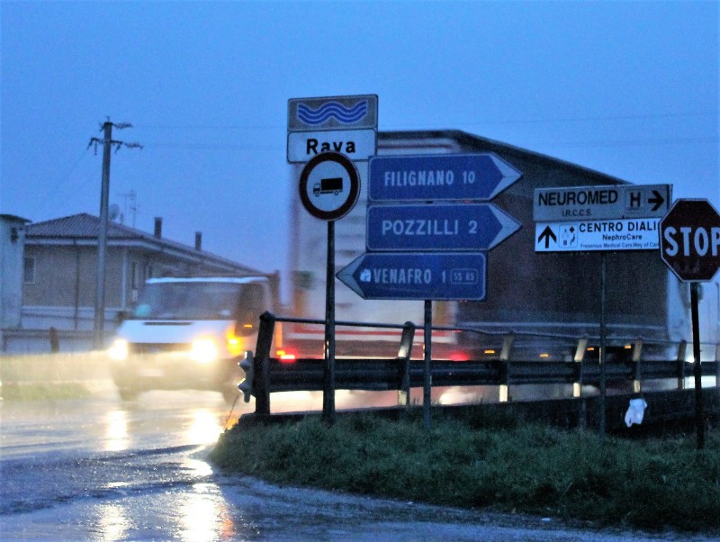 Per quanto incredibile possa sembrare, sulla Statale 85 Venafrana, a un chilometro dal centro di Venafro, c’è un segnale chiarissimo che vieta ai camion, praticamente tutti, di entrare in città. La segnaletica è installata al bivio per Pozzilli, per intendersi dove sorge un noto negozio di fai da te.