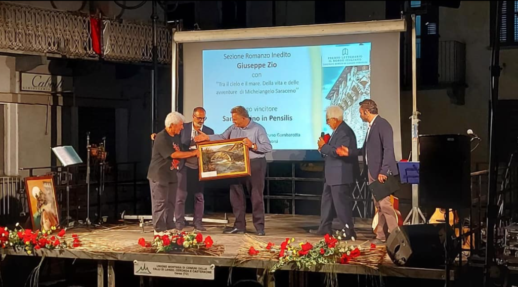 Nella bella cornice del borgo di Lanzo Torinese, in provincia di Torino, a nord della Reggia di Venaria Reale, a ridosso della catena montuosa del Moncenisio, famoso per il celeberrimo Ponte del Diavolo, sabato 17 luglio, si è svolta la serata di premiazione di un importante Concorso letterario nazionale per libri Editi e inediti, “Il Borgo Italiano” che ha la peculiarità di scegliere libri che siano legati e valorizzino alcuni dei mille campanili d’Italia. Hanno partecipato in ben 87 autori, di 19 regioni italiane e nella sezione dei libri inediti, la giuria, presieduta dal giornalista e personaggio televisivo Bruno Gambarotta, ha ritenuto di assegnare il primo premio come il migliore il libro al dott. Giuseppe Zio di San Martino in Pensilis che ha valorizzato al meglio il proprio borgo con lo scritto intitolato “Tra il cielo e il mare. Della vita e delle avventure di Michelangelo Saraceno” con la seguente motivazione: “Bellissime pagine. Scritto in maniera semplice e lineare con una lettura che ti permette di rimanere nel racconto in maniera diretta. Un libro di viaggio ma anche di formazione, dove il protagonista, attraverso un atto e una volontà di vendetta, o meglio di giustizia, diventa adulto e persona di cultura, e attraverso il suo viaggio incontra personaggi importanti”. Il Premio, oltreché una bellissimo dipinto di un autore Locale che rappresenta il famosissimo Ponte del Diavolo, è la possibilità di pubblicare in una collana importante della Casa editrice Tralerighe. Giuseppe Zio ha voluto omaggiare la sindaco di Lanzo Torinese con il libro di storia da lui curato che ha inviato il Sindaco di San Martino in P. Giovanni Di Matteo, e con il Dizionario di Sanmartinese di Domenico Lanese, curato e stampato dall’Associazione culturale Lagrandeonda, di cui lo stesso autore fa parte. Il dott. Zio nel ringraziare la giuria ha sottolineato l’importanza di preservare la storia e gli idiomi dialettali, che sono una ricchezza infinita e variegata della nostra cultura italiana. La serata è stata allietata da musica, interventi di altri autori con opere importanti, ma soprattutto dalla verve ironica del Presidente della Giuria Bruno Gambarotta.