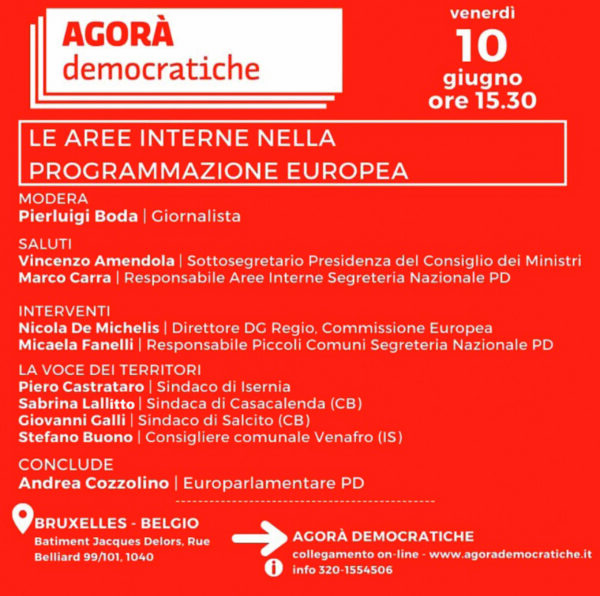 Ai loro contributi seguiranno quelli degli amministratori molisani rappresentati dal sindaco di Isernia Piero Castrataro, della collega di Casacalenda Sabrina Lallitto, del primo cittadino di Salcito Giovanni Galli e del consigliere comunale di Venafro Stefano Buono. Le conclusioni saranno affidate all’europarlamentare dem Andrea Cozzolino.