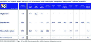 Infine, «secondo lei la situazione (del Molise, ndr) negli ultimi cinque anni è migliorata, peggiorata o rimasta invariata?». Per il 9,5% dei molisani è migliorata, il 53,4% pensa sia peggiorata, il 34,5% è convinto sia rimasta la stessa.