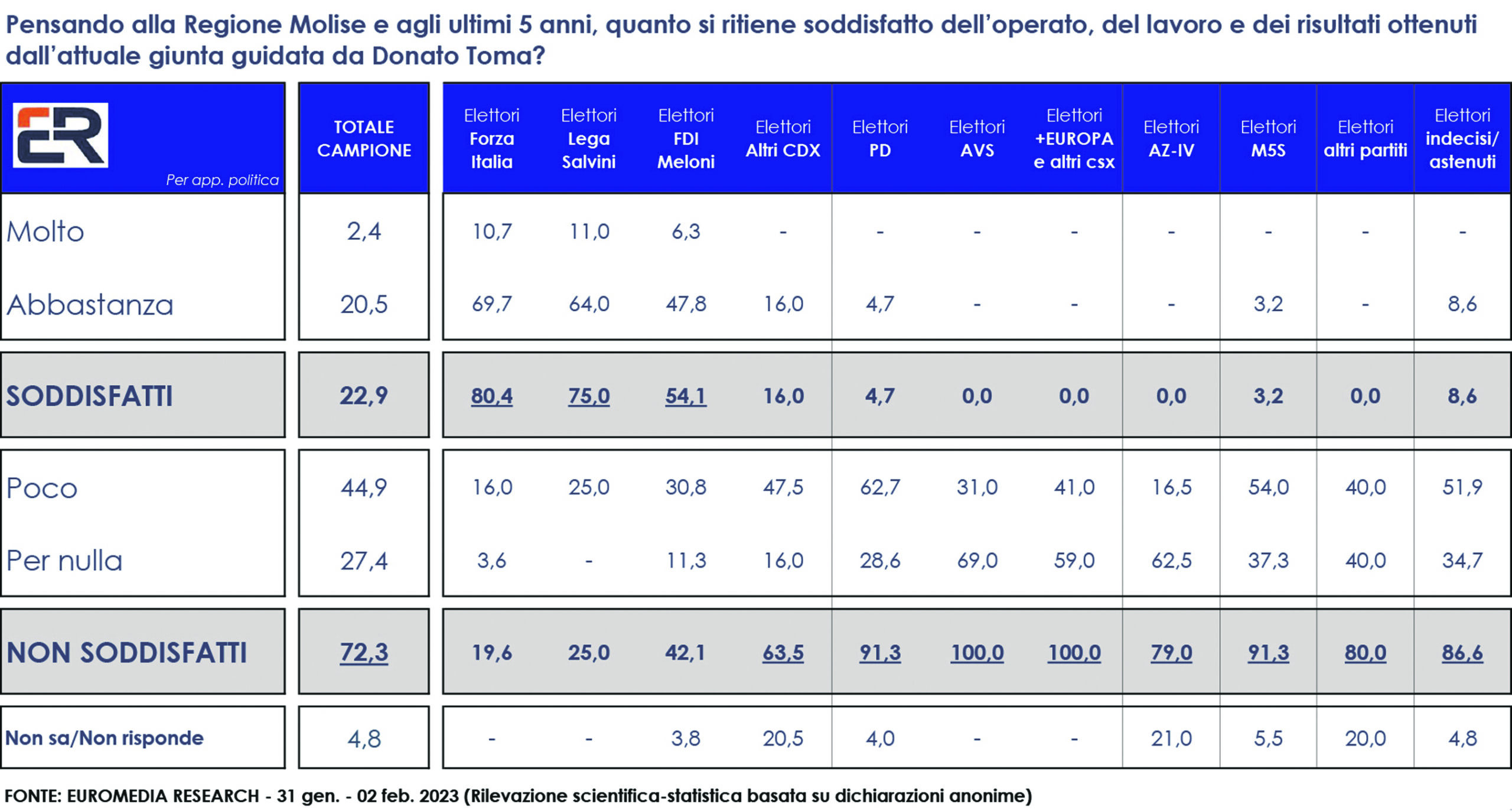«Pensando alla Regione Molise e agli ultimi 5 anni, quanto si ritiene soddisfatto dell’operato, del lavoro e dei risultati dell’attuale giunta guidata da Donato Toma?». A questa domanda il 2,4% del campione si è detto molto soddisfatto, il 20,5% lo è abbastanza (nel complesso dunque il 22,9% promuove l’esecutivo). Mentre il 44,9% è poco soddisfatto e il 27,4 non lo è per nulla (il 72,3% boccia la giunta). Il 4,8% non ha risposto (o comunque non si è espresso).