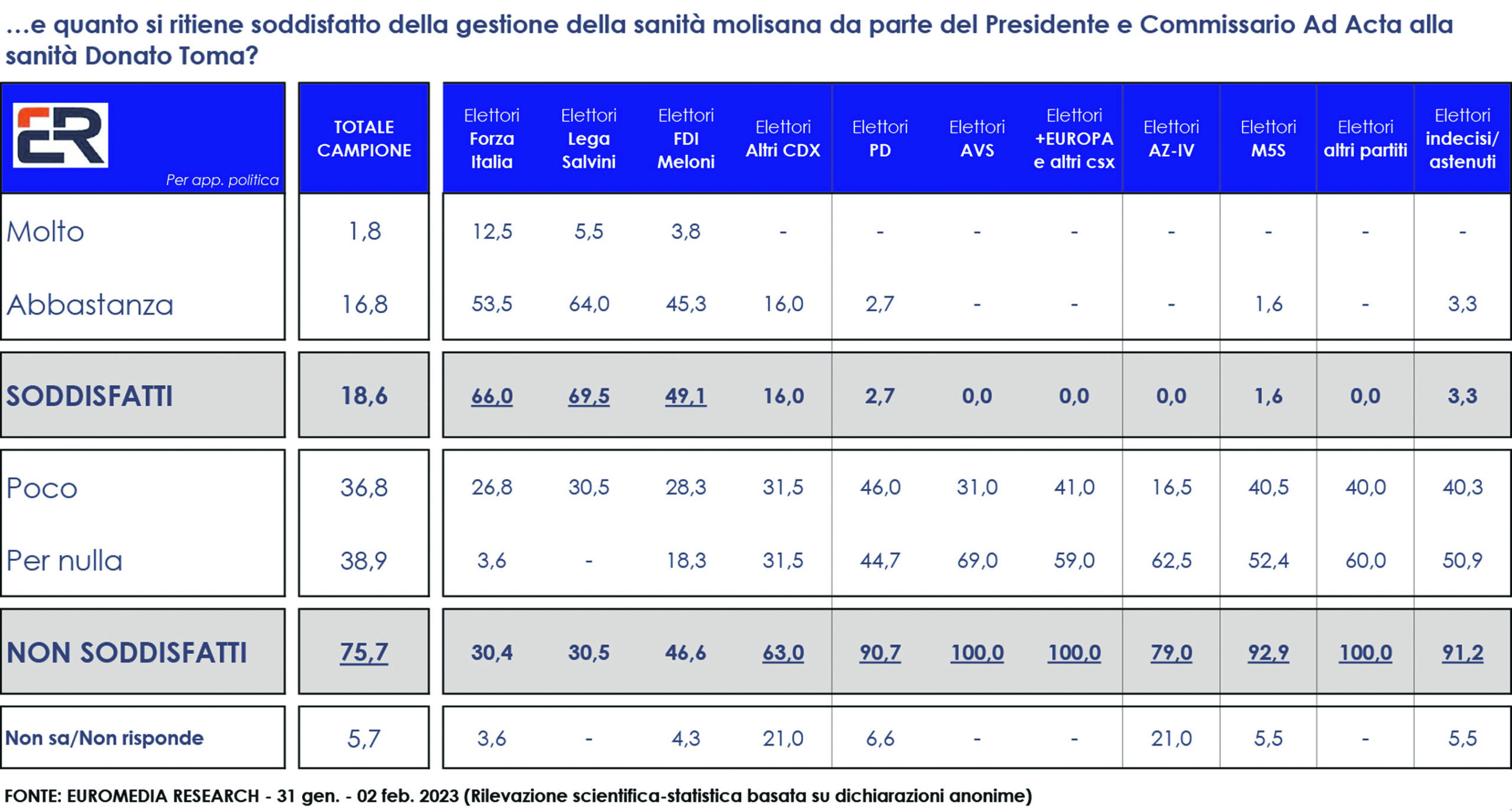 Quando il discorso cade sulla sanità, il gradimento si assottiglia anche fra le mura amiche. Tra gli azzurri, il 66% promuove la gestione di Toma, il 30,4 la boccia. Dati che diventano, rispettivamente 69,5% e 30,5% fra i leghisti, 49,1% e 46,6% fra i meloniani. Nel campo avverso, il 92,9% dei pentastellati boccia il presidente e commissario, il 90,7 dei dem fa lo stesso.