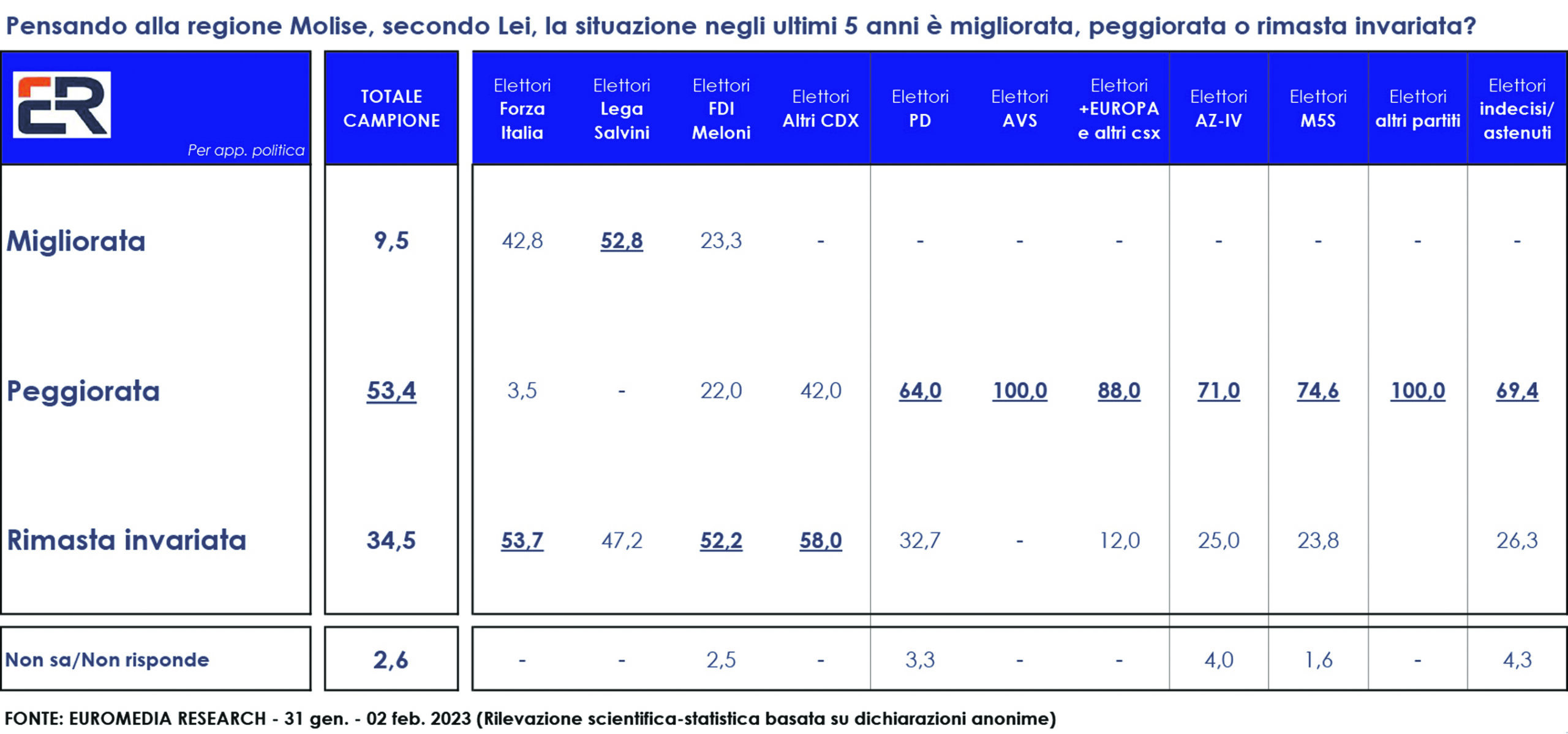 Infine, «secondo lei la situazione (del Molise, ndr) negli ultimi cinque anni è migliorata, peggiorata o rimasta invariata?». Per il 9,5% dei molisani è migliorata, il 53,4% pensa sia peggiorata, il 34,5% è convinto sia rimasta la stessa.