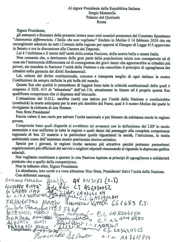 «Lei è l’emblema e il tutore dell’unità della nostra Nazione, della nostra bella e amata Italia. Non consenta – si legge nell’appello – che, a detrimento della gran parte della popolazione talora non consapevole né di cosa sia l’autonomia differenziata né di conseguenza dei gravi danni che apporterebbe ai cittadini più poveri, sia mandata in frantumi l’unità della Nazione e sia cancellato il principio di uguaglianza dei cittadini nella garanzia dei diritti fondamentali. Lei, cultore del diritto costituzionale, conosce e interpreta meglio di ogni italiano la nostra Costituzione da sempre definita la più bella del mondo. Queste Sue alte qualità le permettono di leggere bene tutte le criticità costituzionali delle quali è cosparso il ddl 615 di “attuazione” dell’articolo116, attualmente in itinere ed è proprio questa Sua qualificata competenza che ci dispensa dall’elencarle. L’attuazione del ddl sarebbe (sarà) una iattura per l’unità della Nazione e costituirebbe (costituirà) la morte anticipata per le aree più derelitte del Paese, qual è il nostro Molise dal quale le rivolgiamo la richiesta di non firmare. Non firmi Presidente! Faccia valere il suo ruolo per salvare l’unità nazionale e per liberare da subitanea morte le regioni povere.