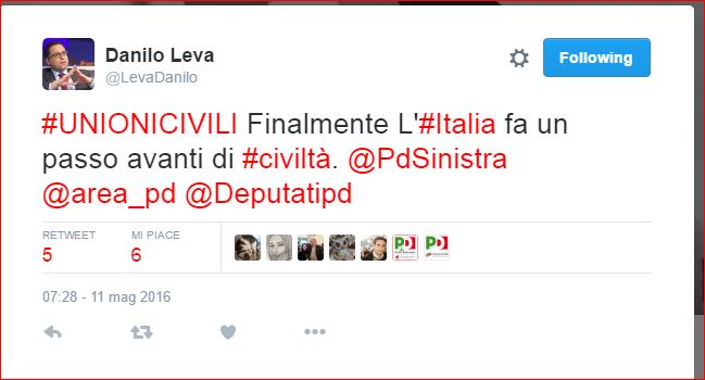 “Oggi è un giorno di festa”, aveva scritto su Fb il premier Matteo Renzi a poche ore dal voto, ricordando l’impegno nella battaglia per i diritti civili di Alessia Ballini, sindaco omosessuale di San Piero a Sieve e sua assessora alla Provincia di Firenze, scomparsa cinque anni fa.