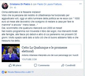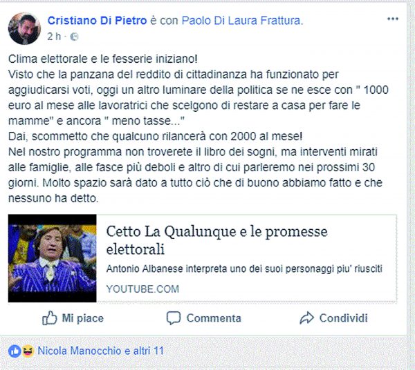 Nel pomeriggio di uno degli ultimi giorni a disposizione per lavorare all’unità del centrosinistra, il figlio dell’uomo che sembrava il candidato naturale della sintesi – quell’Antonio Di Pietro da cui tutti vogliono ancora ascoltare i motivi del “no grazie” – si diverte a stuzzicare l’avversario candidato governatore del centrodestra Donato Toma. Che in mattinata ha preso parte alla conferenza del Popolo della Famiglia. Ne condivide il programma, ha detto, che tra le altre cose prevede il reddito di maternità. Di Pietro jr quindi posta una scena di Cetto Laqualunque e scrive: «Clima elettorale e le fesserie iniziano! Visto che la panzana del reddito di cittadinanza ha funzionato per aggiudicarsi voti, oggi un altro luminare della politica se ne esce con “1000 euro al mese alle lavoratrici che scelgono di restare a casa per fare le mamme” e ancora “meno tasse…”.