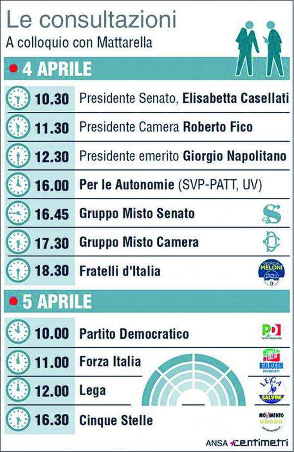 Un mese dopo le politiche, cominciano le consultazioni del Presidente della Repubblica per la formazione del nuovo governo. Stamattina alle 10.30 si parte con la presidente del Senato Elisabetta Casellati. Chiudono i 5 Stelle, domani alle 16.30.