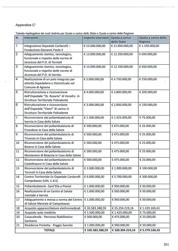 Sono 21 gli interventi previsti, il più importante è l’integrazione tra l’ospedale Cardarelli di Campobasso e la Fondazione Giovanni Paolo II, previsti 23 milioni di euro. Seguono poi l’adeguamento sismico, tecnologico funzionale e alle norme di sicurezza degli ospedali di Termoli e Agnone (13 milioni per ciascuna struttura), la realizzazione di un polo integrato per l’attività ospedaliera e distrettuale ad Agnone (5 milioni), la ristrutturazione e riconversione in strutture territoriali polivalenti degli ospedali di Venafro (4 milioni) e Larino (3 milioni), la riconversione in Case della Salute dei poliambulatori di Isernia (1,5milioni di euro), Frosolone (500mila euro), Trivento (500mila euro), Bojano (500mila euro), Montenero di Bisaccia (500mila euro), Castelmauro (500mila euro) e Termoli (2 milioni di euro).