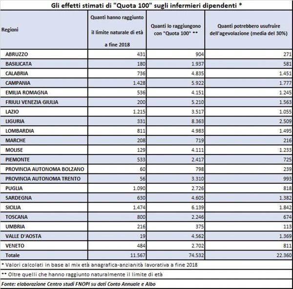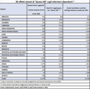 «Il rapporto numerico infermieri pazienti era già ai limiti del rischio prima di ‘quota 100’ – spiega Tonino Aceti, portavoce Fnopi – ma ora con questa ulteriore emorragia di professionisti la situazione si aggrava. Inoltre, più del 36% delle nuove fuoriuscite dal sistema avverranno nelle Regioni in piano di rientro, già gravemente colpite dal blocco del turnover e il 61% delle nuove carenze è nelle Regioni che dal nuovo sistema di monitoraggio del Livelli essenziali di assistenza risultano inadempienti. Il combinato disposto tra l’attuazione di ‘Quota 100’, il mancato superamento del tetto di spesa per il personale sanitario e il blocco del turnover, rischia di essere la formula perfetta per “mandare in pensione” anche il servizio sanitario pubblico. Se non si adotteranno immediate e profonde contromisure a collassare sempre di più saranno i Livelli essenziali di assistenza già in forte difficoltà e si rafforzeranno le disuguaglianze. Aumenteranno le liste di attesa e le difficoltà di accesso alle cure da parte della popolazione soprattutto delle Regioni in piano di rientro, aumenterà la conseguente necessità di ricorrere al privato magari utilizzando le risorse derivanti dal reddito di cittadinanza, per chi lo prenderà».