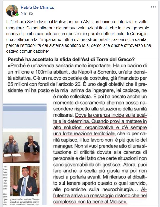 In Molise, fra gli altri commenti, quello del consigliere regionale dei 5 Stelle Fabio De Chirico. Ha commentato su Facebook l’intervista rilasciata dal dg a Primo Piano Molise evidenziando di condividere in particolare alcuni passaggi. Quelli in cui Sosto spiegato che sulla sua scelta ha pesato anche «un momento di scoramento che non posso nascondere rispetto alla situazione della sanità molisana. Dove la carenza incide sulle scelte e le determina. Quando provi a mettere in atto soluzioni organizzative e c’è sempre una forte reazione territoriale, che io per carità capisco, il tuo lavoro non è più quello del manager». Battaglie per tenere aperti reparti, quando la disponibilità di personale non consente di farlo in sicurezza, polemiche sulle soluzioni trovate per la neurochirurgia… in questo modo – altro concetto condiviso da De Chirico – «all’utenza arriva un messaggio distorto che nel complesso non fa bene al Molise».