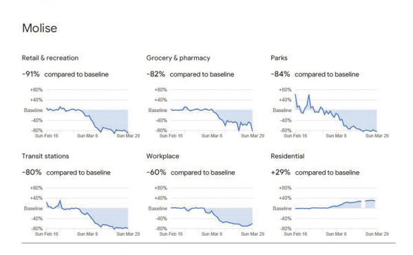 Alimentari e farmacie del Molise hanno visto scendere l’afflusso dell’82%, -91% per la vendita al dettaglio e le attività ricreative (quindi far e ristoranti), -84% per i parchi, una flessione dell’80% si è registrata per i trasporti e del 60% per il lavoro. La residenzialità in regione è aumentata del 29%.