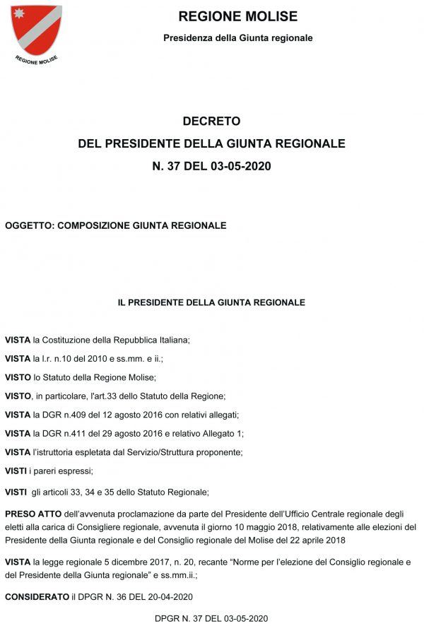 C’è il decreto che ufficializza l’uscita di scena della Lega di Salvini dal governo regionale. Pubblicato ieri pomeriggio dal governatore Donato Toma il provvedimento con il quale vengono rinominati