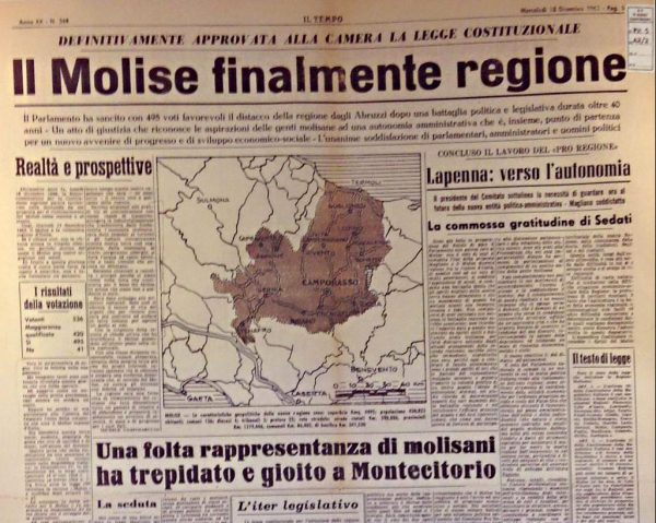 Quest’anno ricorrono due eventi: cinquantasette anni dalla legge costituzionale numero 3 del 27 dicembre 1963, che sancì l’autonomia del Molise, e cinquant’anni dalla costituzione delle regioni a Statuto ordinario.