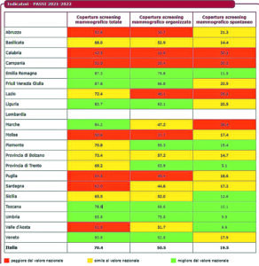 In Italia, nel periodo preso in esame, il 70% delle donne fra i 50 e i 69 anni si è sottoposto allo screening mammografico a scopo preventivo, all’interno di programmi organizzati o per iniziativa personale, secondo quanto raccomandato dalle linee guida nazionali e internazionali che suggeriscono alle donne di questa classe di età di sottoporsi a mammografia ogni due anni per la diagnosi precoce del tumore al seno.