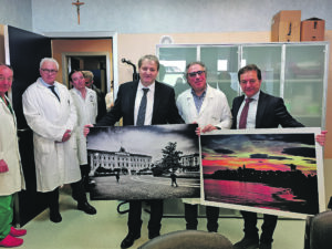 In chiusura della cerimonia, l’omaggio del primario Rocchia al governatore Roberti (un quadro di Campobasso) e al dg Di Santo (un’immagine di Termoli).