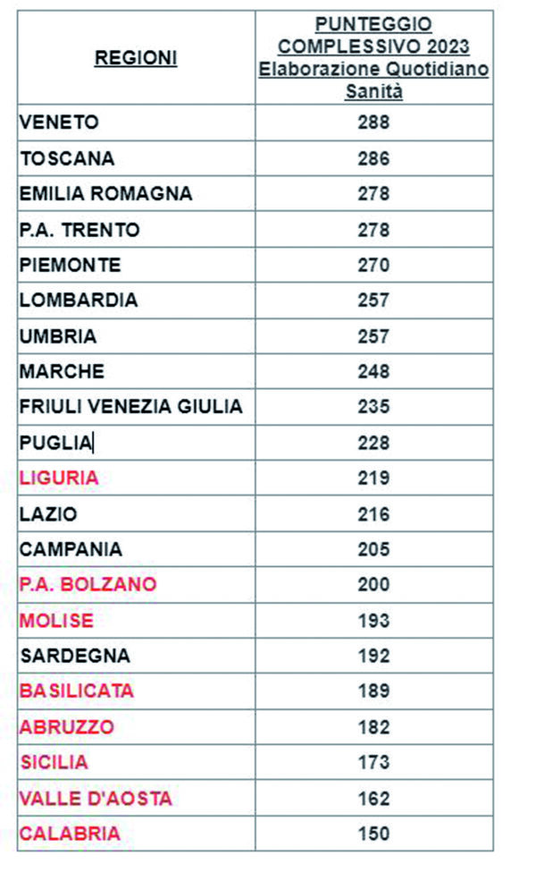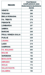 Ancora una volta, comunque, un Paese spaccato. I risultati migliori si registrano infatti al Centro-Nord, nonostante la Lombardia esca dalla cinquina dei migliori: Veneto (288), Toscana (286), Emilia Romagna (278), P.A. Trento (278) e Piemonte (270). Di contro, tra le ultime cinque Regioni quattro sono al Centro-Sud: Basilicata (189), Abruzzo (182), Sicilia (173), Valle d’Aosta (162) e, fanalino di coda, la Calabria (150). Il Molise, complessivamente, ha un punteggio pari a 193.