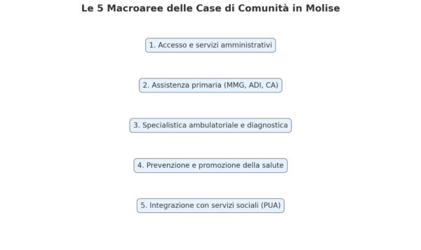 Le Case di Comunità saranno articolate su cinque macroaree: accesso e servizi amministrativi (Centro unico di prenotazione, scelta/revoca medico di base/pediatra di libera scelta), assistenza aprimaria (medico di base, continuità assistenziale, assistenza domiciliare), specialistica ambulatoriale e diagnostica di base, prevenzione e promozione della salute, integrazione socio-sanitaria tramite il Punto unico di accesso (Pua). Il medico di medicina generale, oltre alla normale attività ambulatoriale e domiciliare, potrà essere coinvolto in attività di case management, partecipazione alle equipe di Valutazione multidimensionale, teleconsulto, formazione su percorsi diagnostico terapeutici e interazioni con gli altri professionisti del territorio.
