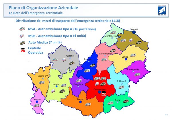 Col regolamento firmato ieri dal dg Sosto e dai direttori sanitario e amministrativo Lucchetti e Forciniti, inoltre, l’Asrem rende operativa anche la rete del 118 rimodulata con l’atto aziendale di aprile 2018. Le 16 postazioni restano tutte di soccorso avanzato. In quattro di queste (Agnone, Campobasso Monte Grappa, Isernia e Termoli) la presenza dell’ambulanza principale andrà integrata (sempre h24) con una di tipo ‘B’. Infine, le sedi di Agnone, Castelmauro, Campobasso Monte Grappa, Isernia, Riccia, Termoli e Trivento dovranno essere dotate anche di auto medica 24 ore su 24. Questo vuol dire che le associazioni che puntino a gestire, per esempio, la postazione di Campobasso Monte Grappa dovranno presentare un progetto con la dotazione prevista (ambulanza principale, secondaria e auto medica col relativo personale).