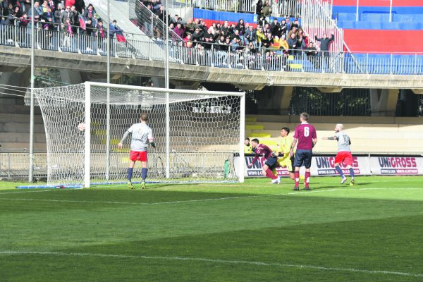 lo dicevano già i numeri dei tagliandi venduti in prevendita. Domenica mattina, infatti, la Curva Nord era già sold out, mentre per la tribuna rimanevano solo qualche decina di posti ancora a disposizione, risultato: Romagnoli pieno in ogni ordine di posto. Da brividi anche la coreografia organizzata dalla Curva, con la gigantografia di Scorrano immersa tra bandierine rossoblù, mentre in campo la società consegna la maglia numero 2 alla famiglia dell’eterno capitano, con applausi scroscianti che hanno accompagnato l’intera cerimonia. Passando alla cronaca si vede subito un Campobasso voglioso di fare propria la partita e un’Olympia Agnonese che non vuole lasciare nulla al caso. Nei primi minuti, infatti, regna un totale equilibrio, con le due formazioni che si studiano a vicenda. Per vedere la prima azione da gol bisogna aspettare il 21’ con Zammarchi che dalla destra inventa un assist in profondità per Cogliati, Mejri anticipa in uscita. Al 22’ grande iniziativa di Cogliati sulla destra, il professore sfugge in velocità e crossa in mezzo per Candellori che non riesce a colpire di testa. Ancora Cogliati pericoloso dopo poco su lancio lungo di Vanzan sul quale Mejri esce male, Zammarchi raccoglie la sfera e calcia a porta semi guarnita Ciampi salva sulla linea. Al 34’ la prima vera azione offensiva di marca granata, Minicucci in corsa tenta il tiro da fuori area ma la traiettoria finisce alta sulla traversa. Si arriva così al 42’: punizione dall’out sinistro per l’Agnonese, Pejic calcia alto sulla traversa. Su